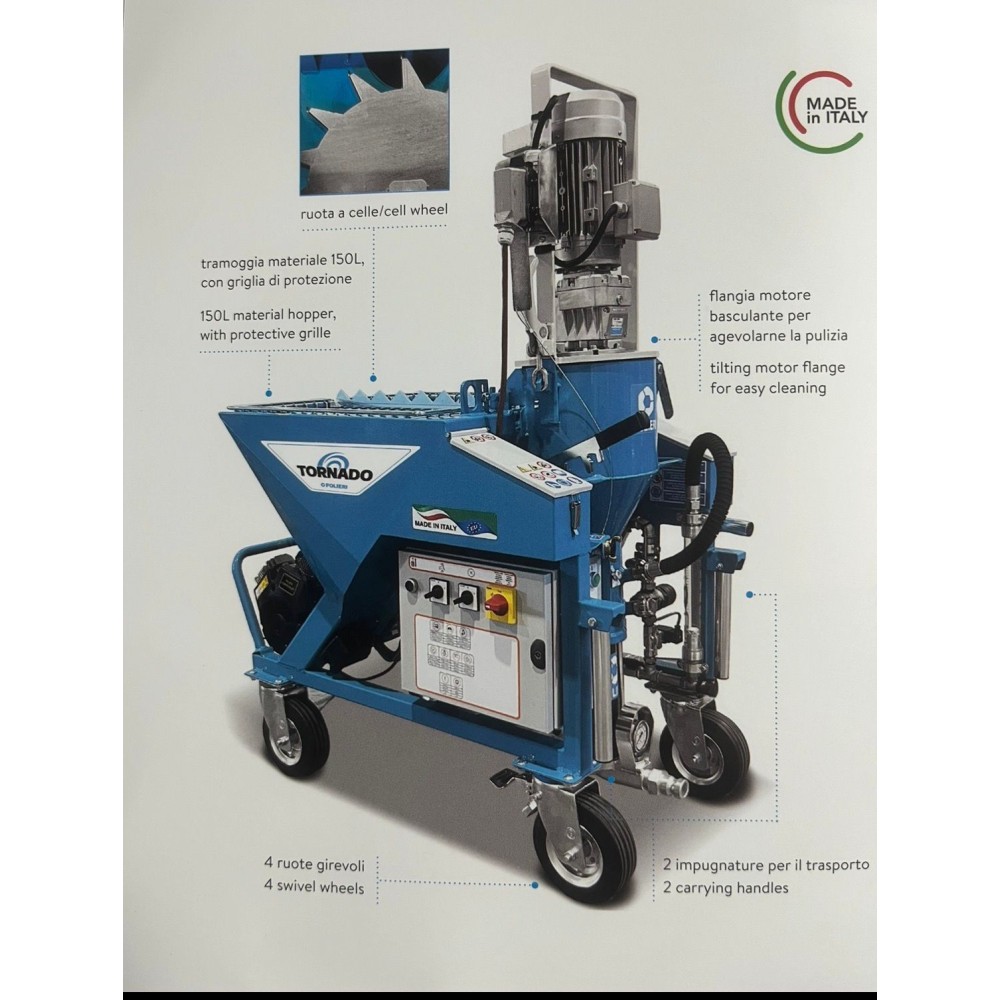 La Pompa impastatrice continua consente la spruzzatura di intonaci pre-miscelati a base di gesso, calce/gesso, calce/cemento, intonaci di finitura, stucchi, intonaci colorati, collanti, sottofondi per pavimenti e malte. E' dotata di quadro elettromeccanico. Camera miscelazione smontabile basculante. Prodotto secco separato alla miscelazione.